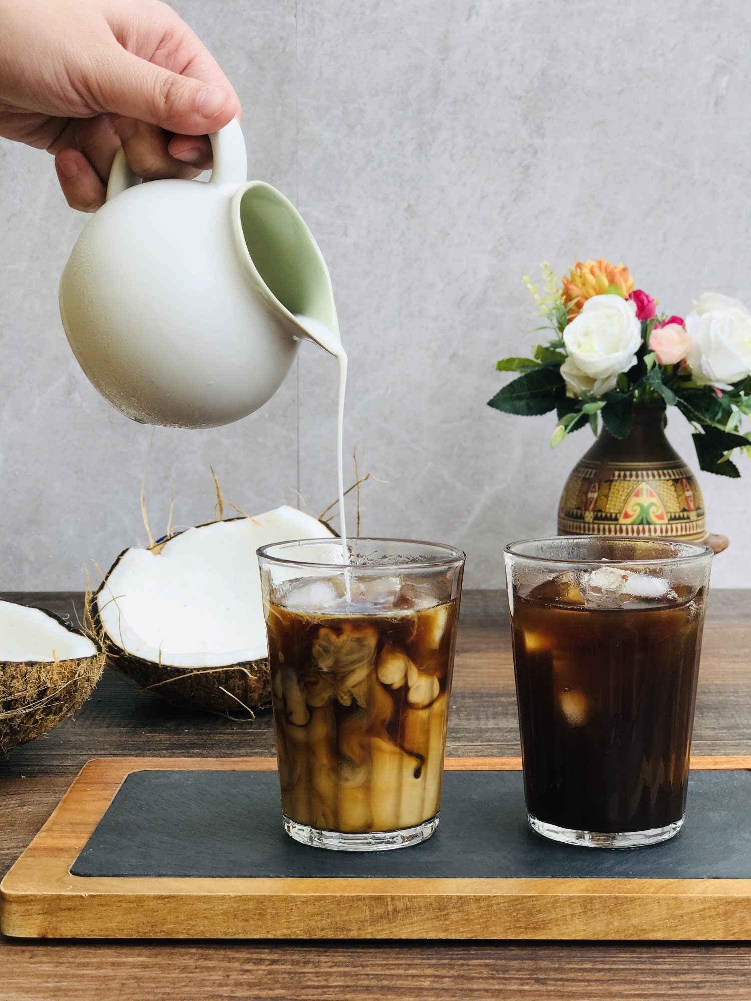 Pour cold brew coffee into two cups with ice, add sugar then pour coconut milk. Serve!