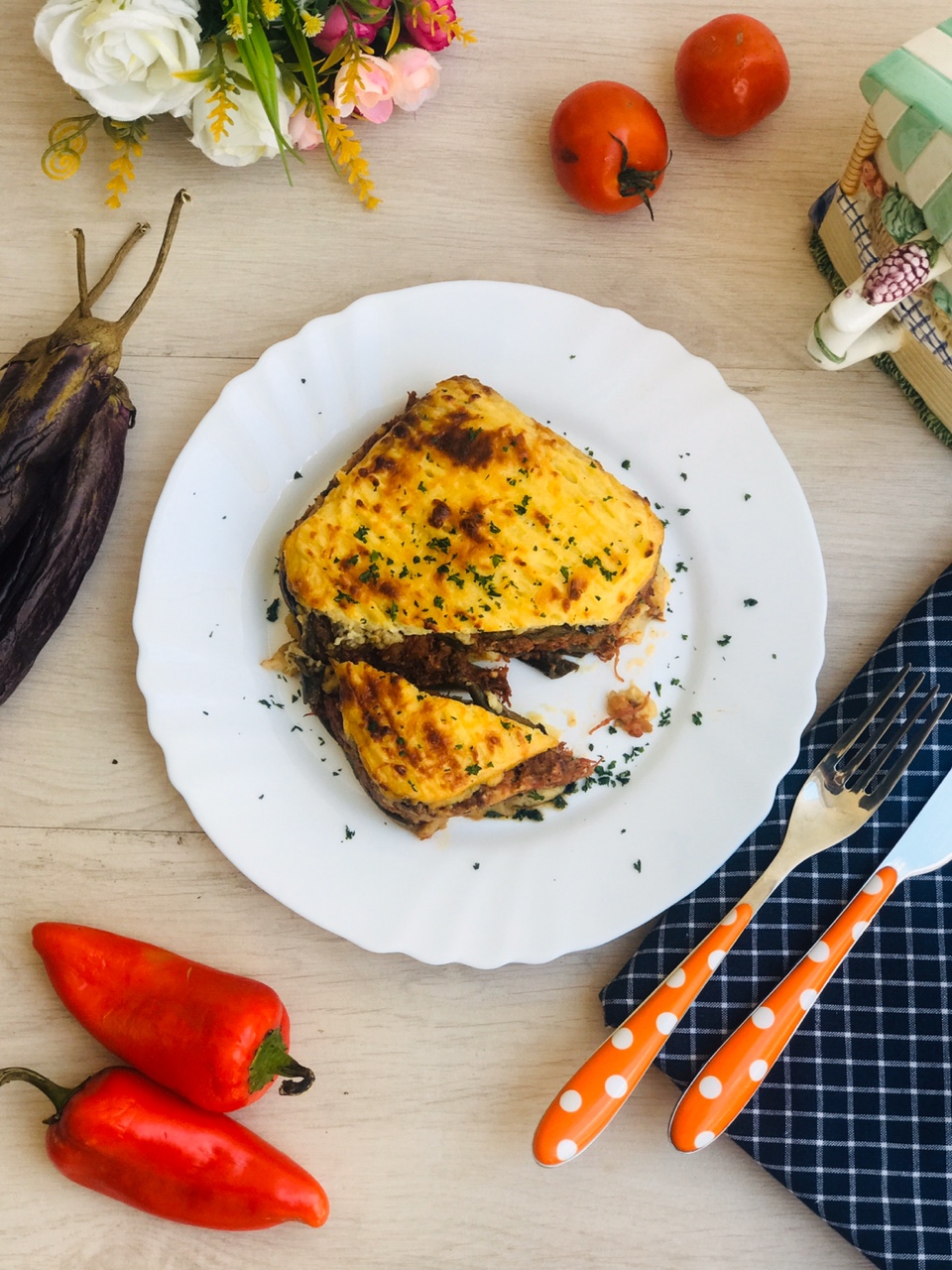 Assemble the moussaka. Butter the bottom and sides of the pan and layer the eggplants. Pour in the meat sauce and even out. Add a second layer of eggplants, top with mashed potatoes and and egg mixture.