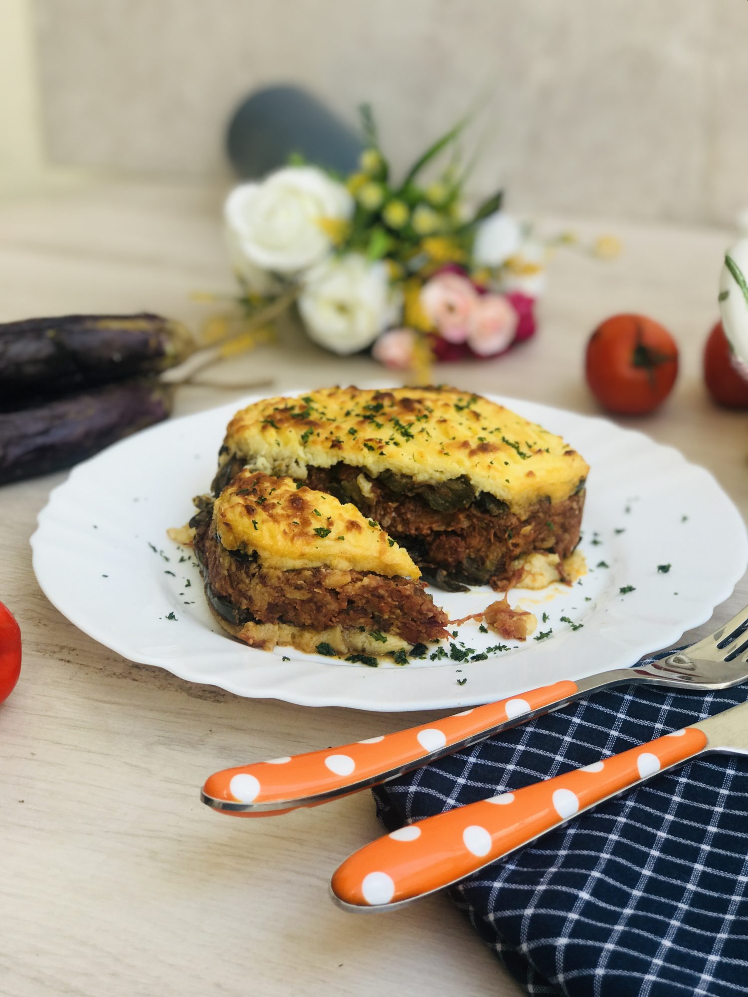 Bake the moussaka casserole on the center rack of the heated oven for 30 minutes.