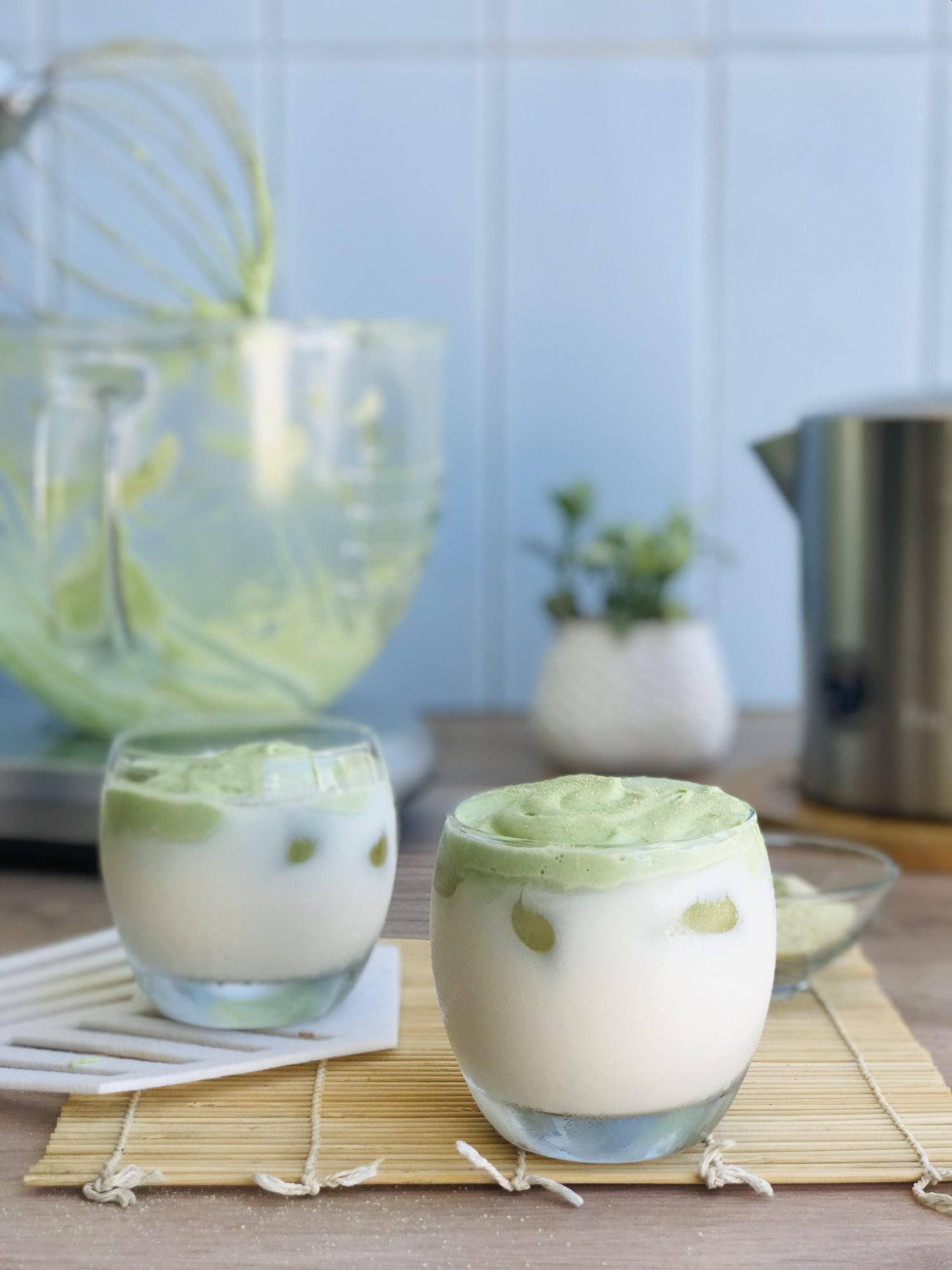 Place some ice cubes into your desired glass. Pour in your milk of choice and top with the whipped matcha. Feel free to sprinkle on some matcha powder if desired, stir together and enjoy!