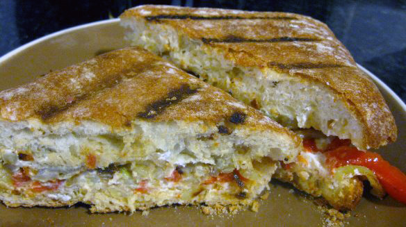 Place he sandwich into the flat side of the Breville Grill and press lightly for 2 mins until grill marks become brown and visible.