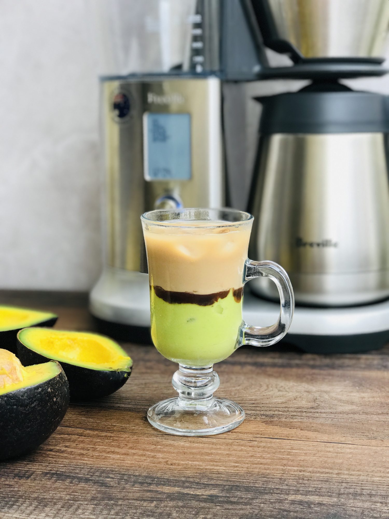 Assemble the drink by pouring the smooth avocado pureé at the bottom of two cups, drizzle each cup with chocolate syrup, add the remaining milk, brewed coffee and ice. Serve and enjoy!