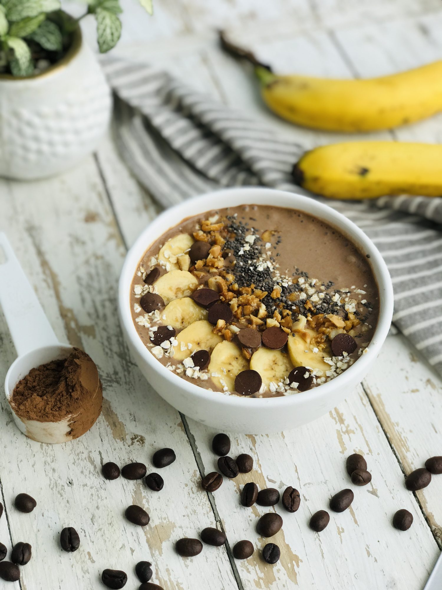 Using the Breville Blender, combine frozen bananas, almond butter, honey, cocoa powder, and 1 shot of espresso. Press the “smoothie” function and process for 2 mins.