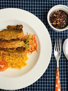 Serve the Crispy pork belly together with annato garlic fried rice and garnish it with atchara and sliced fresh tomatoes (optional).