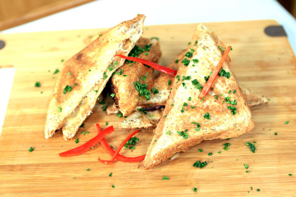 Allow the Breville Jaffle Maker to preheat (with the lid closed) until the Green light ‘Ready’ illuminates. During this time fill the bread with the pork and beans and sprinkle with grated cheese then brush it with melted butter side up.