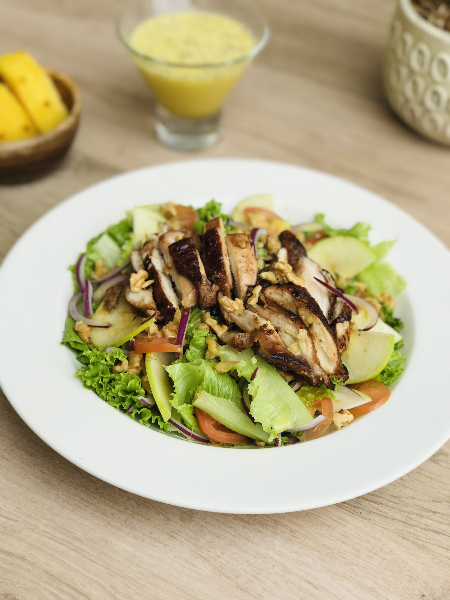 Slice the chicken thigh fillet into strips and top it into the salad. Serve pineapple vinaigrette on the side. Enjoy.