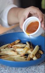 Transfer the fries to a bowl, season with pepper, garlic powder, and 2 tsp. Of salted egg paste. Toss to coat.