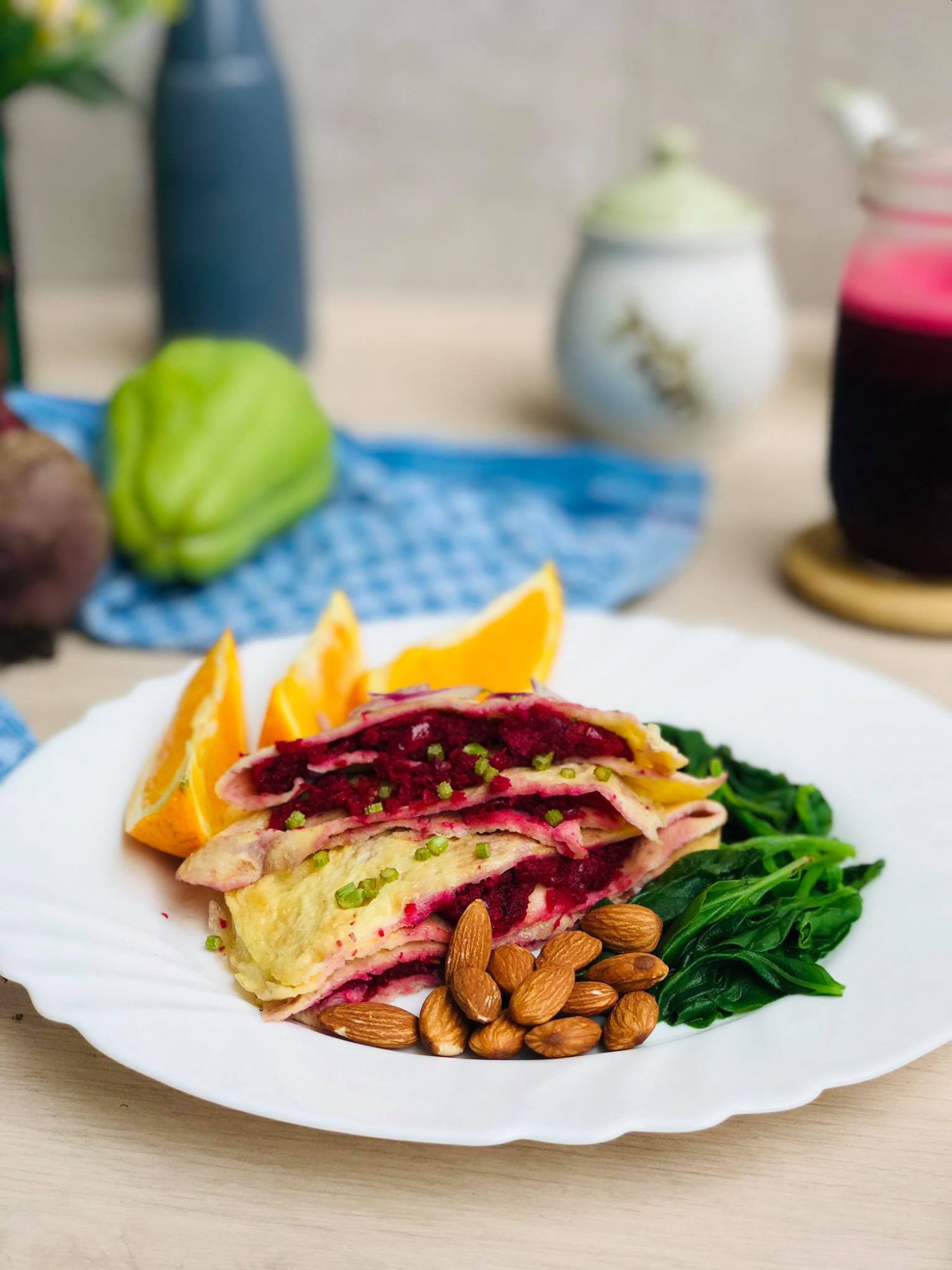 Add the juice pulp to the omelet (as a filling) and fold the omelet. Cook for another 1 minute.